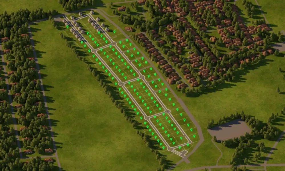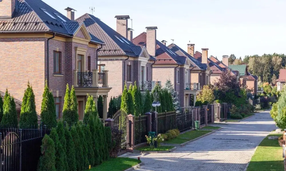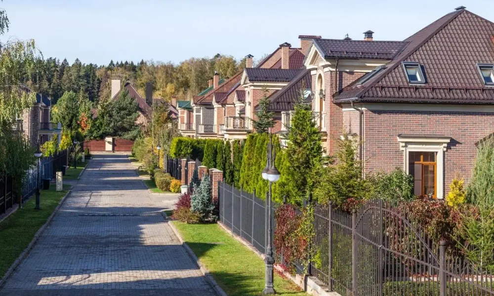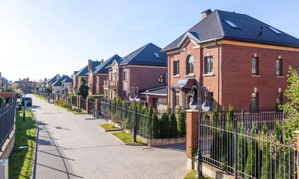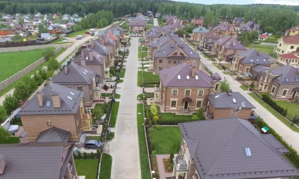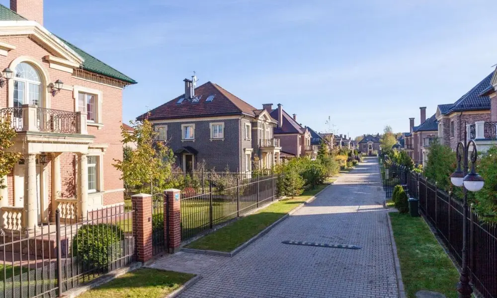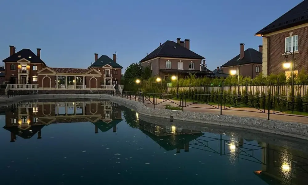 На его территории стоят кирпичные одно-, двух- и трехэтажные дома с монолитными перекрытиями, мансардными этажами и просторными балконами (80-180 квадратных метров), возведённые в стиле Георгианской архитектуры - классической загородной архитектуры Англии. Представлено 5 проектов домов, планировка индивидуальная. К домам подключены все коммуникации. Заборы открытые, рядом – ухоженные зелёные насаждения.