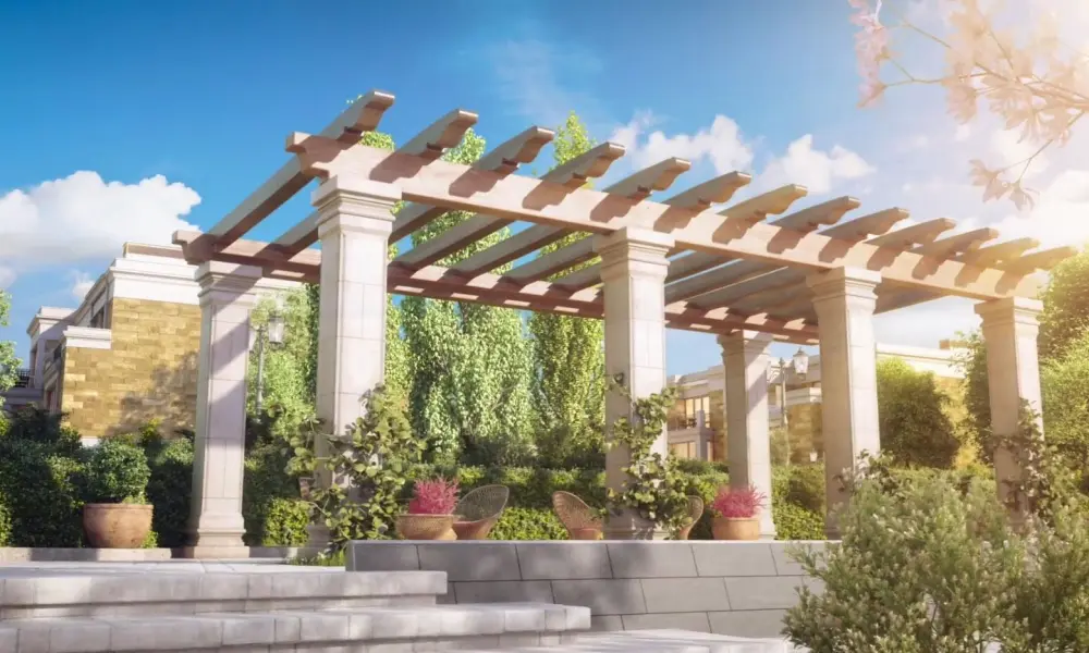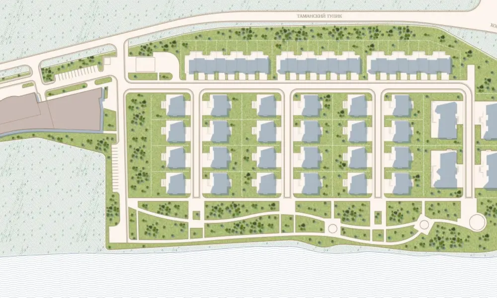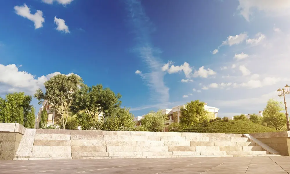 24 виллы, 4 резиденции с бассейном и 24 трёхэтажных таунхауса с террасами на крыше имеют собственные земельные участки и парковки; круглосуточно работает консьерж-служба. Фасады зданий выполнены из травертина и гранита в светлых оттенках с авторским дизайном – постройки гармонично вписываются в окружающую природу. Территория посёлка огорожена, под охраной.