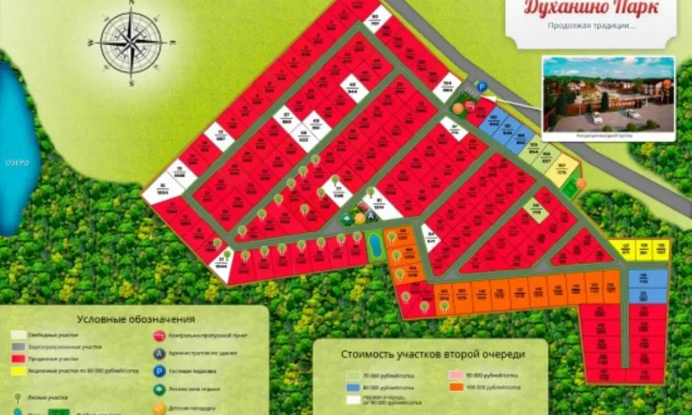 На генеральном плане посёлка – участки под строительство 8-13 соток (электричество подведено), детский игровой комплекс, спортплощадка, гостевая парковка и зелёные зоны отдыха. На территории есть свой собственный пруд. До реки с пляжами и пристанями – 10 минут пешком.