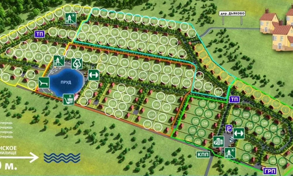 Здесь расположены участки от 6 соток с возможностью расширения площади. Подведено электричество, водоснабжение (скважина), газ. Построены дома в стиле баухауса (12 проектов площадью от 95 до 189 квадратных метров). Территория закрытая, под охраной, и на ней созданы все условия для разнообразного досуга.