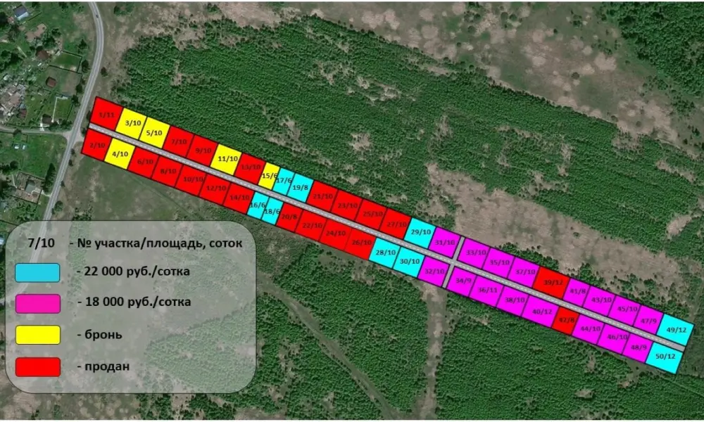 Территория поселка поделена на 50 земельных участков под дачное строительство. Площадь каждого - от 6 до 12 соток.