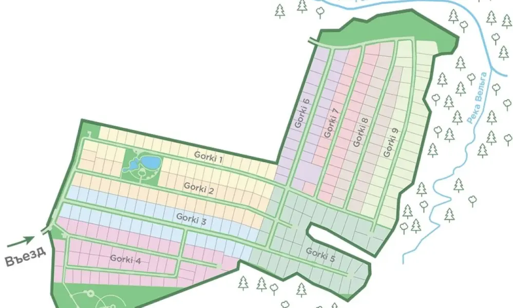 По периметру поселок окружен лесным массивом с вековыми деревьями. Жильцам доступны выходы на множество живописных полян в тени массивных сосен и елей. В округе можно собирать ягоды и грибы, а для эстетического наслаждения можно выйти к побережью протекающей неподалеку реки Вельга.