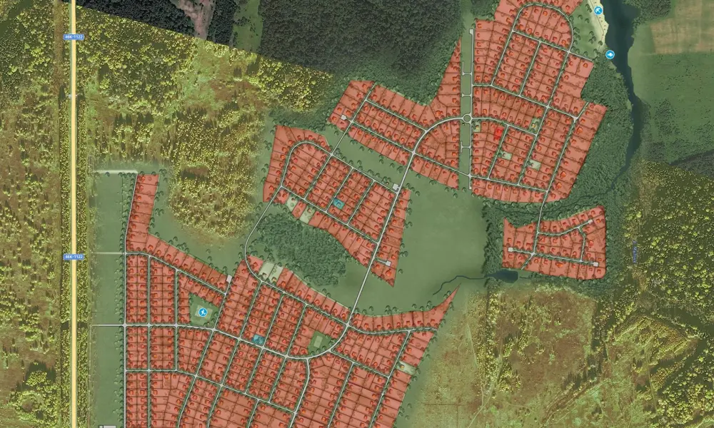 На 706 участках (7-65 соток), можно построить коттедж по любому индивидуальному проекту (без строительного подряда). Ко всем участкам подведено электричество, газовые сети проходят до границы посёлка. Есть доступ к высокоскоростному интернету.