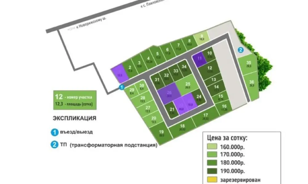 Площадь участков в коттеджном посёлке начинается от 8 соток. Общая площадь поселения составляет 6 га.
