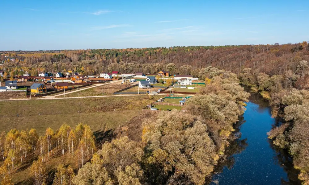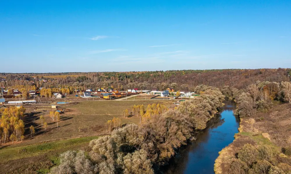Коттеджный посёлок «Мёд» стоит неподалёку от реки Лопасня в окружении многокилометрового лесного массива у деревни Прудно.