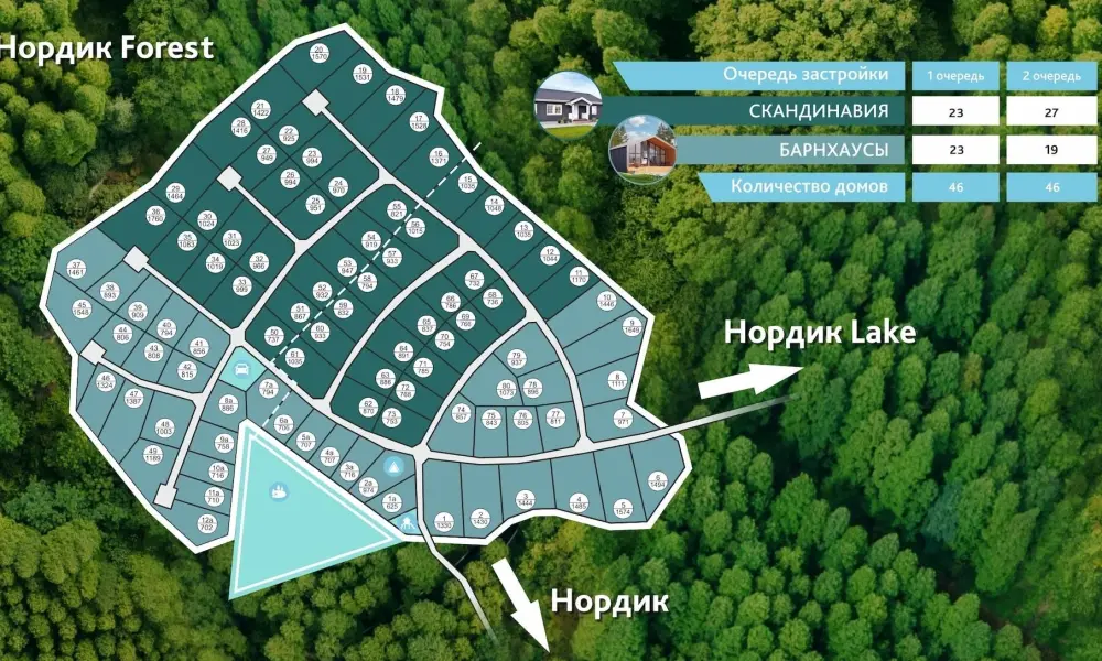80 участков «Нордик фореста» поделены на кварталы: Скандинавия, Барнхаус и А-фрейм, что предполагает строительство домов в соответствующих стилях. С некоторых участков есть собственный выход прямо в лес. Ко всем домовладениям уже подведены инженерные коммуникации, водоснабжение - из артезианской скважины.