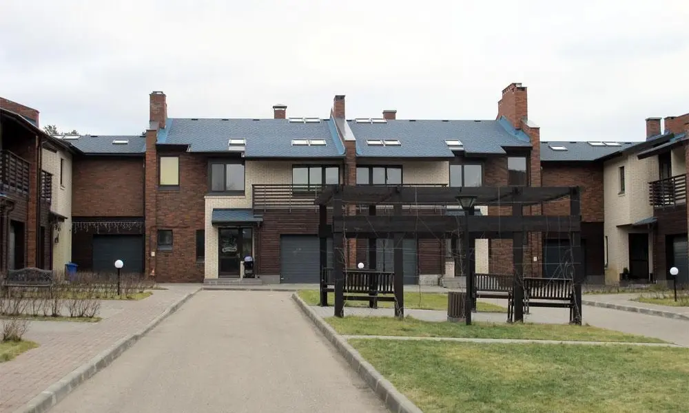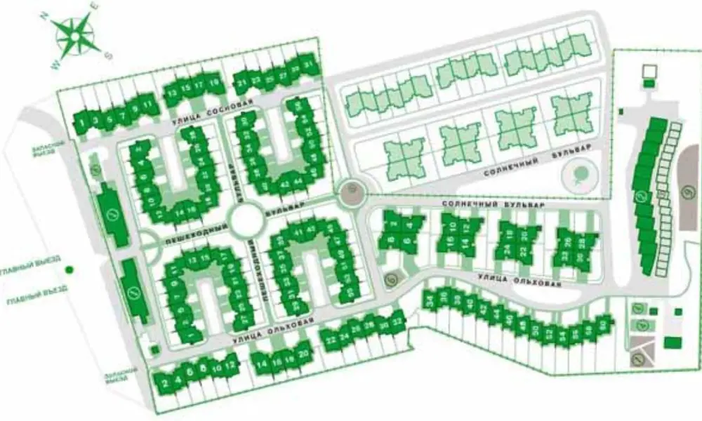 Здесь возведены 118 таунхаусов, объединяющих 2-3-этажные коттеджные блоки – в этом уникальность архитектуры посёлка. У каждого блока (площадь от 197 кв.м.) – своя планировка, отдельный вход и участок (0,4-4 сотки). Подведены центральные коммуникации, интернет и телефония. Для автотранспорта предусмотрены гаражи в самих таунхаусах и отдельно стоящий гаражный комплекс, для гостей – гостевая парковка.