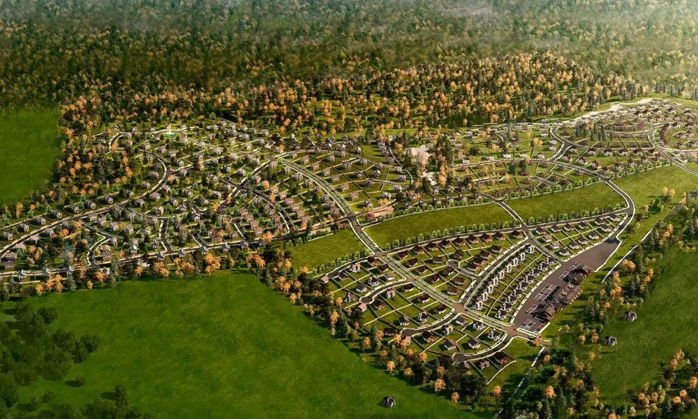 По всему периметру поселок окружен хвойным лесом. Также в нем есть множество тропинок, которые ведут к озеру, уютным полянкам и прочим живописным локациям. Соседство с лесом дает ощущение близости к природе.