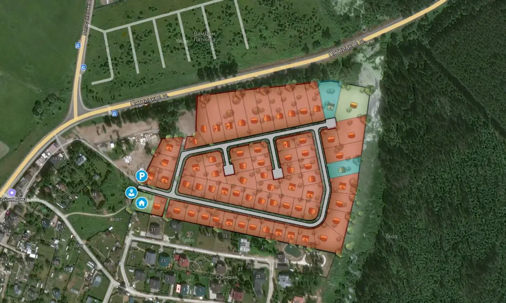 В плане посёлка – 85 участков от 6 соток с коммуникациями. Также тут построены внутрипоселковые дороги, есть площадки для игр с детьми и спорта, гостевая парковка. Территория огорожена, круглосуточно охраняется.