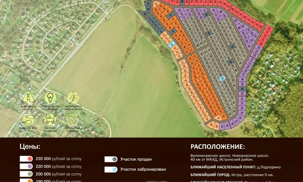 В КП – 264 участка по 6-9 соток под ИЖС. Подведено электричество (15 кВт). В самом посёлке – дорожная сеть из асфальтовой крошки, детская площадка, охраняемый пункт пропуска (территория посёлка огорожена).