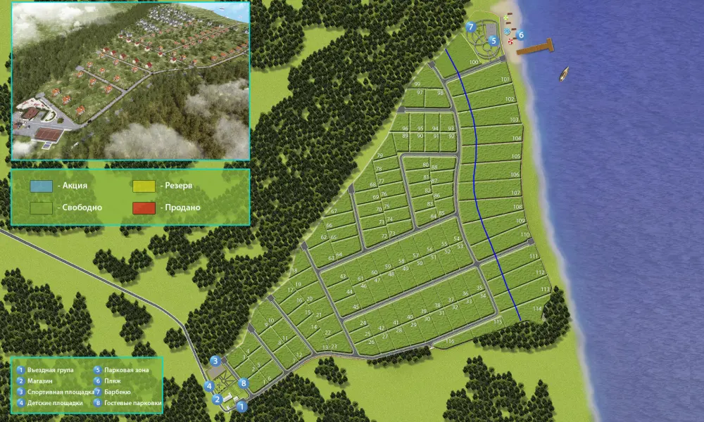 На территории открыт магазин, сделаны спортивные и детские площадки. Благоустроены парковые зоны и зоны барбекю, а также места недалеко от водоемов, где можно купаться, кататься на лодке и ловить рыбу. Там водится угорь, белый амур, форель, толстолобик. Рыбалкой на озере занимаются круглогодично.