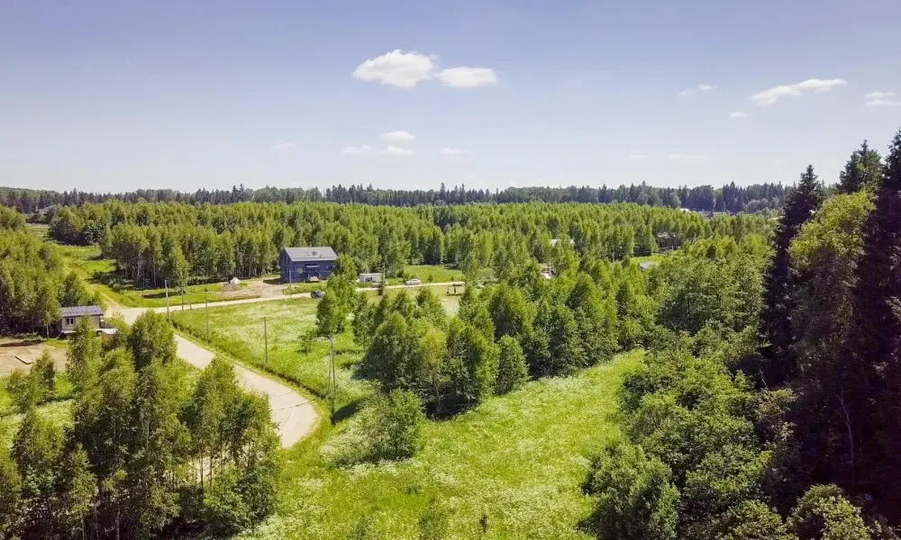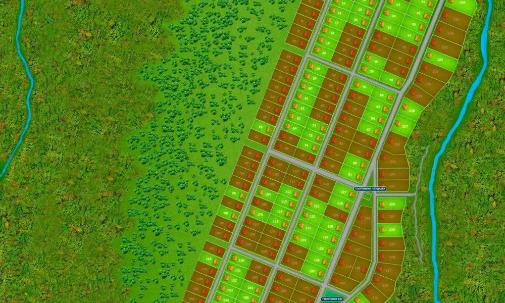 Застройщик предлагает разные участки от 8 до 50 соток; многие из них засажены деревьями. В лесной зоне поселка есть водоём. Летом здесь можно ловить рыбу, а зимой - кататься на коньках.