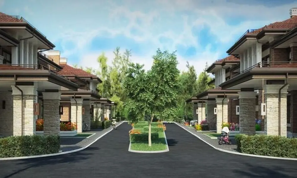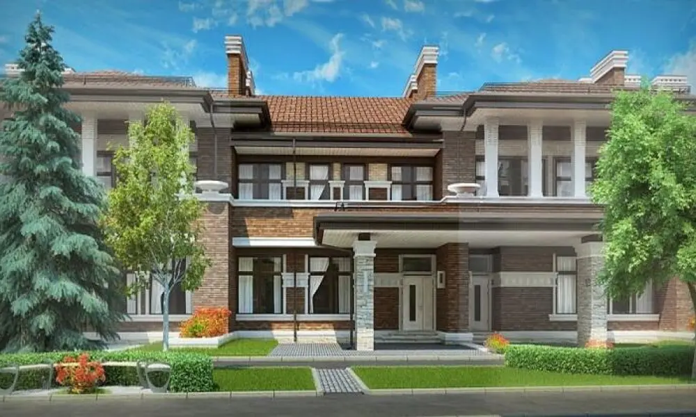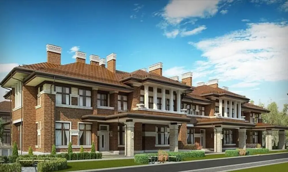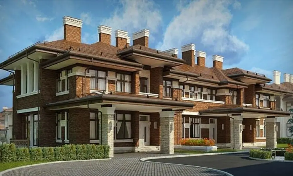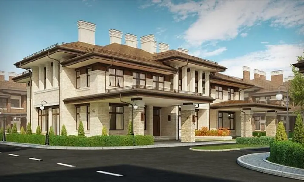 Коттеджный поселок “Рига!Рига!” состоит из уютных двухэтажных таунхаусов в едином архитектурном стиле Ллойда Райта, которые удачно вписываются в природный ландшафт. Особняки выглядят статусно: обширные террасы, мансарда с видом на живописный пейзаж, палисадники 0,5-4 соток и специальный навес для автомобиля. Облицовка фасада состоит из камня, что в сочетании с величественной архитектурой придает дому солидный вид.