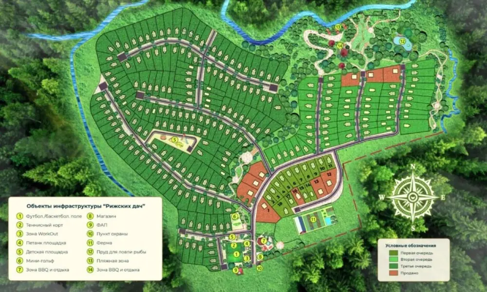 Территория обустроена ландшафтным дизайном. Также на ней есть зоны барбекю, поле для мини-гольфа, зимний каток, множество спортивных и детских площадок на свежем воздухе. Веселое времяпровождение гарантировано как юным жильцам поселка, так и их родителям.
