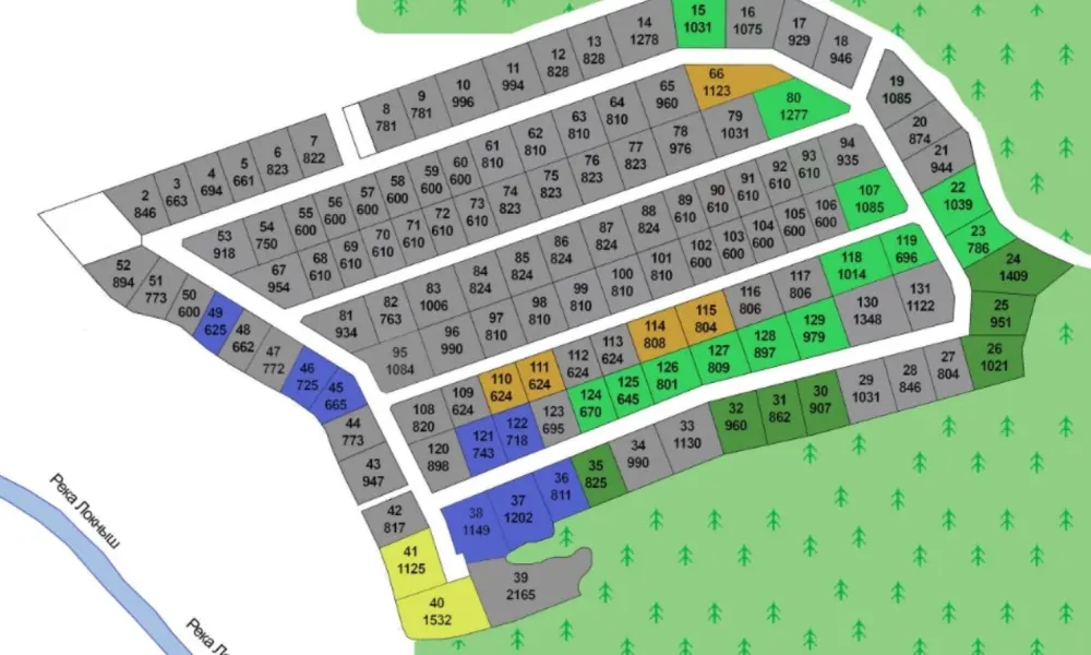 В посёлке 132 участка без строительного подряда (от 6,24 до 15, 32 соток). Подведено электричество, благоустроены внутрипоселковые дороги, территория огорожена и охраняется.