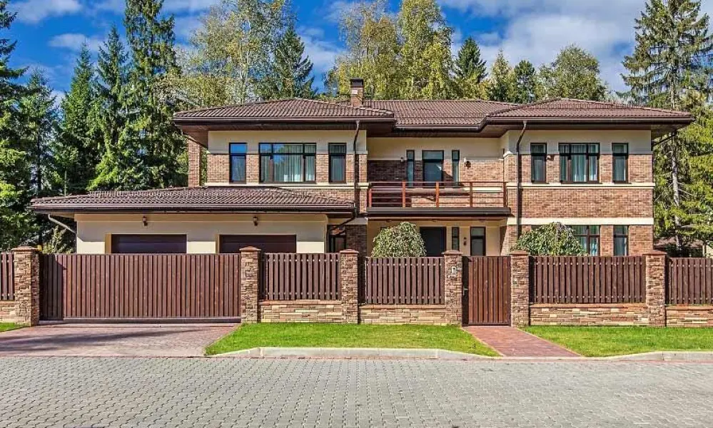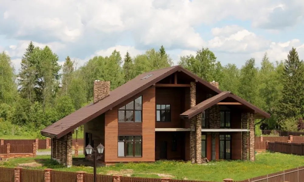 Коттеджи возведены преимущественно из клееного бруса. Но в лесной части поселка предусмотрено несколько участков, которые выделены специально под строительство домов из камня.