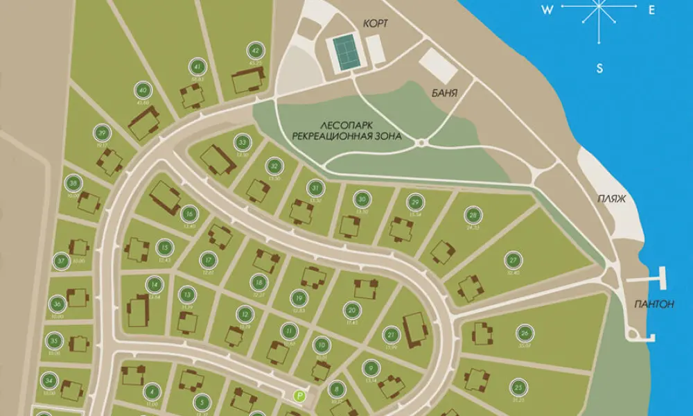 На территории поселка предусмотрен собственный небольшой лесопарк. Недалеко от побережья находится теннисный корт для любителей активного отдыха. Также жильцам предлагает свои услуги баня, где можно расслабиться в компании друзей.
