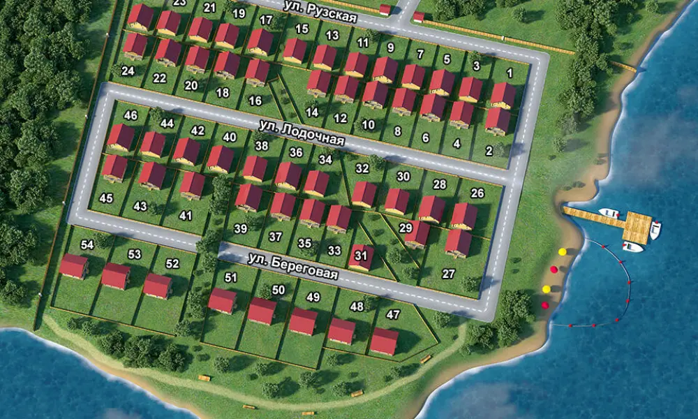 «Рузские берега» - клубный коттеджный посёлок у большой воды (Верхнерузское водохранилище), построенный в единой архитектурной концепции русского деревянного зодчества (дома из брусьев).
