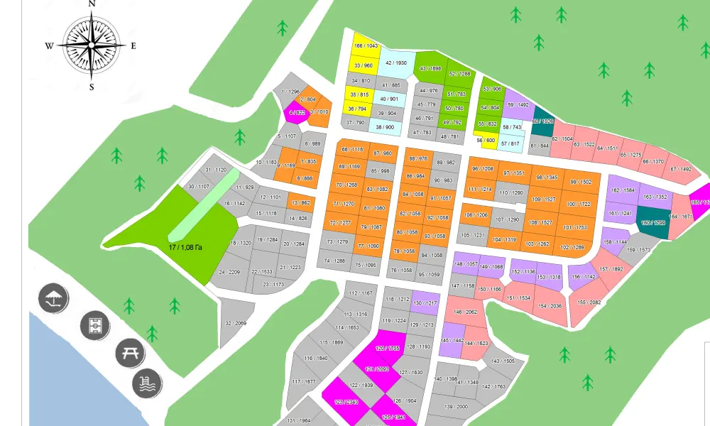 Поселок включает в себя 160 участков земли различного размера, от семи до двадцати соток, с обеспечением 15 кВт электроэнергии. Участки без подряда, подходят для строительства домов любого типа или для использования по собственному усмотрению. Здесь можно создать пруд или бассейн, заняться огородничеством и многим другим. Важно помнить, что разведение птиц и скота на данной территории запрещено, но возможности для личного творчества и развития здесь огромны.