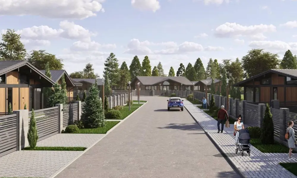 Поселок занимает площадь в 8,5 гектаров с размещенными на ней 65 участками, размеры которых варьируются от 8,5 до 16 соток. Дома в поселке построены в уникальном фахверковом стиле, который придает уют и особую эстетику каждому коттеджу. Общее ограждение, внутренние заборы и въездные группы выполнены в едином стиле, что визуально подчеркивает единство.