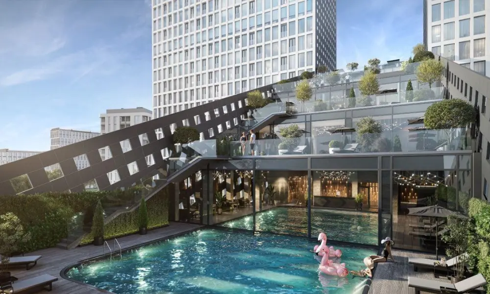 Здесь располагается собственный SPA-центр с открытым бассейном и панорамными видами на столицу, офисный центр с конференц-залом и амфитеатром, подземный паркинг, кафе, супермаркет, а также приватные общественные пространства для резидентов, где можно провести частные и детские мероприятия, организовать досуг, позаботиться о своей красоте и здоровье.