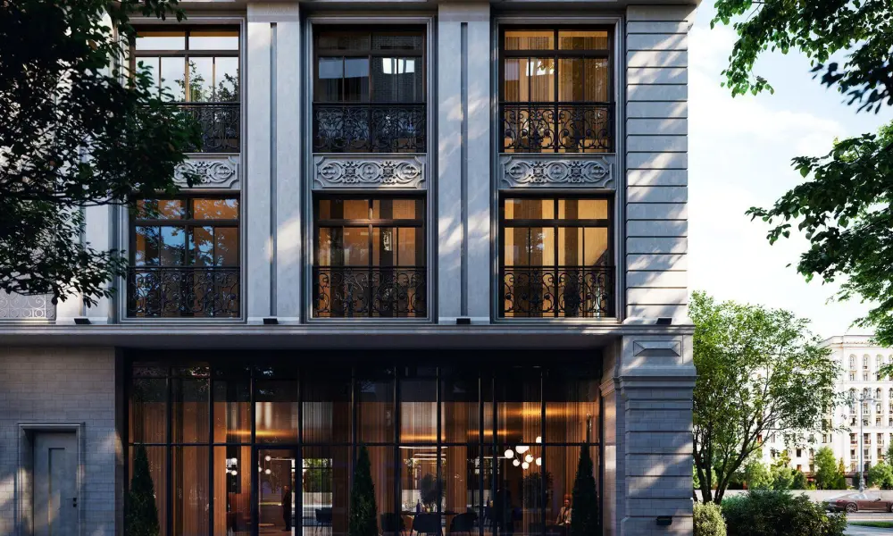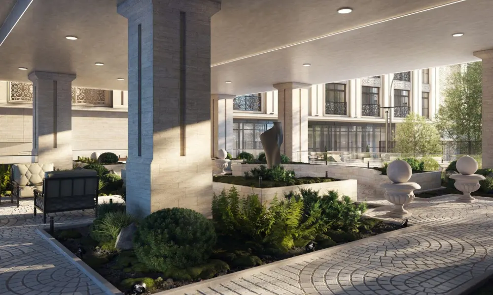 Пространство двора будет закрыто ажурной кованой оградой, вечерняя подсветка дома в обрамлении зелени дополнит атмосферу уюта и камерности. Отличительная особенность проекта— приватное патио с тенелюбивыми растениями и арт-объектами. В лобби есть лаунж-зона с камином и мягкими креслами, а также отдельная зона для собственных мероприятий резидентов — деловых или личных. Здесь удобно провести переговоры, организовать фуршет или коктейльный вечер.
