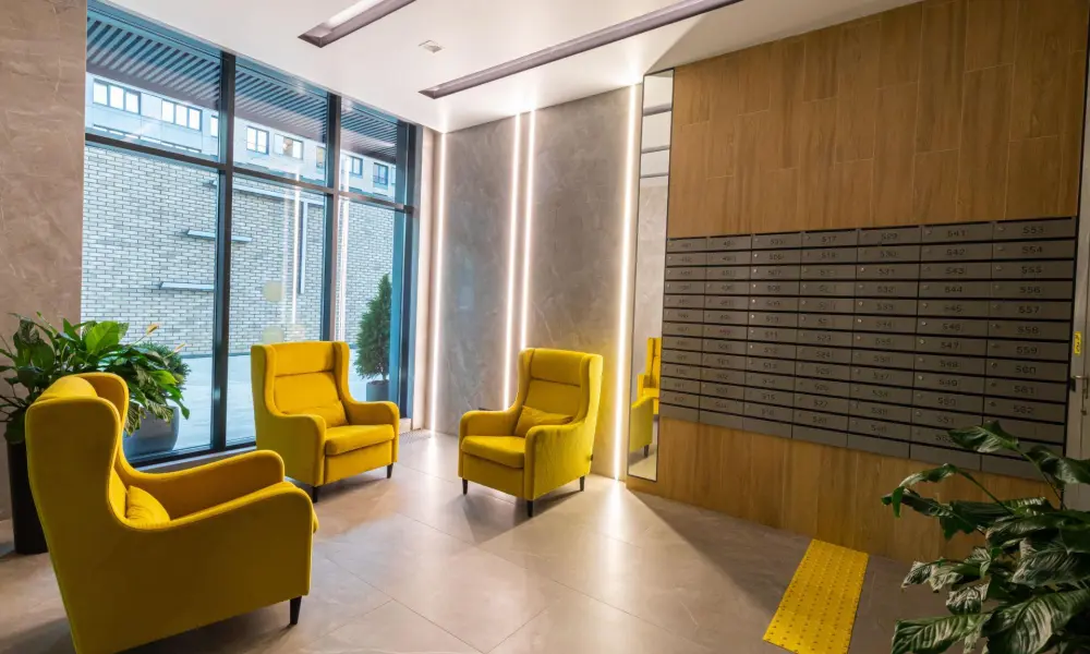 Всех, кто заходит в дом, встречает просторное лобби. Посетители и жители сразу попадают в домашнюю атмосферу.