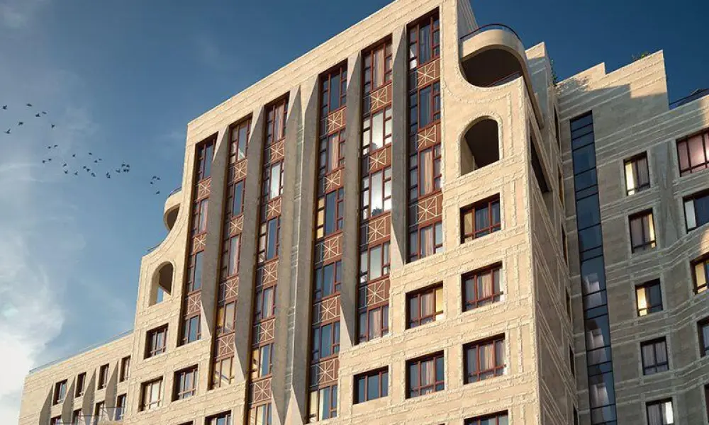 Авторская архитектура в стиле ар-деко, эффектные входные группы и террасы в апартаментах подчеркивает высокий статус и привилегированное расположение дома. Роскошная отделка фасадов юрским доломитом создает неповторимую комбинацию обработанной и природной текстуры натурального камня. Проект создан в московском бюро «Архитектон+», основанном Александром Зусиком в 2001 году. Дом напоминает довоенные здания Нью-Йорка и Чикаго, выглядит респектабельно и фундаментально. В отделке входных групп использованы ценные породы дерева и натуральный мрамор, для удобства гостей предусмотрены зоны ожидания с дизайнерской мебелью, стойка рецепции выполнена из натурального полированного и колотого гранита.