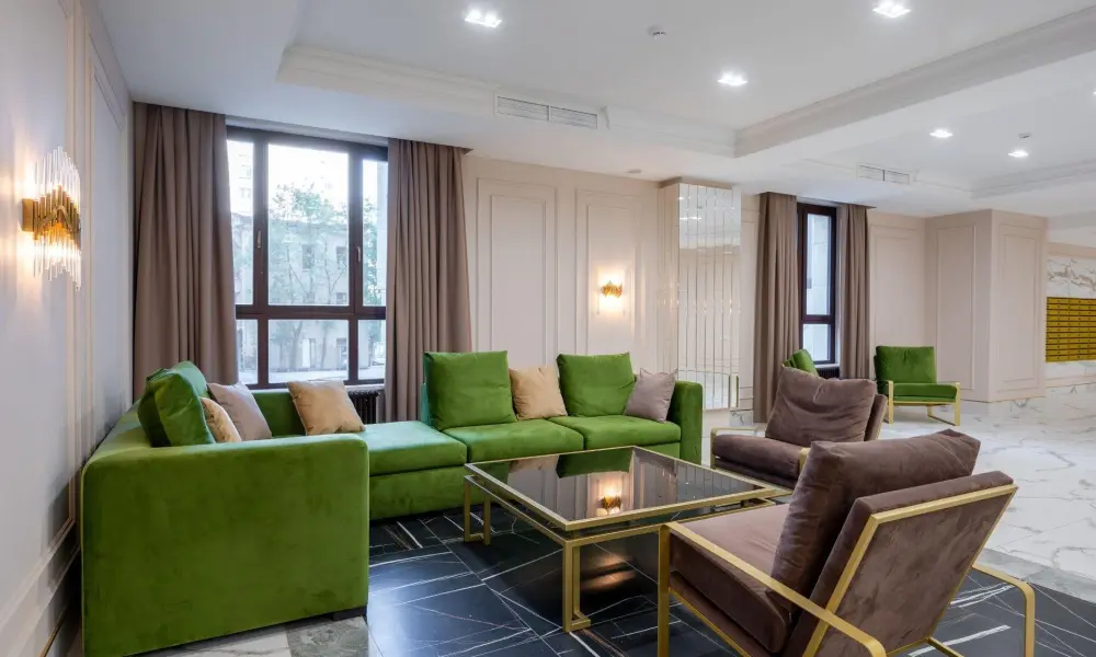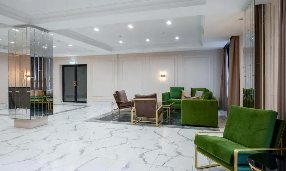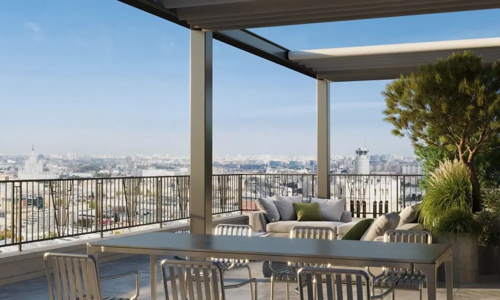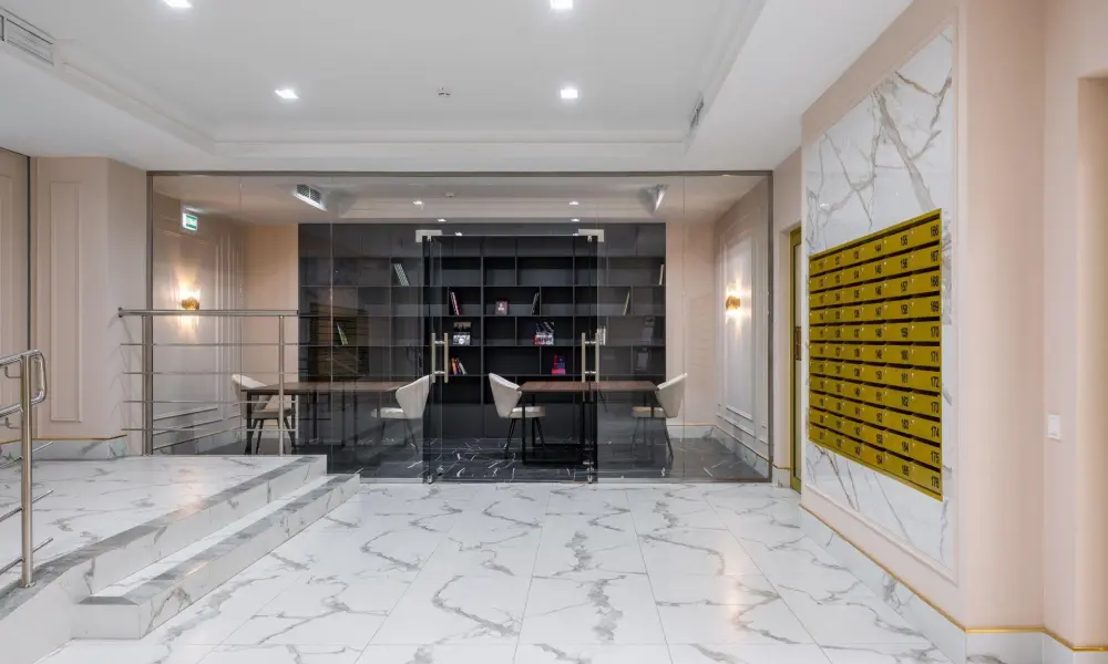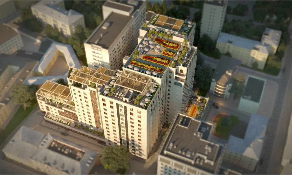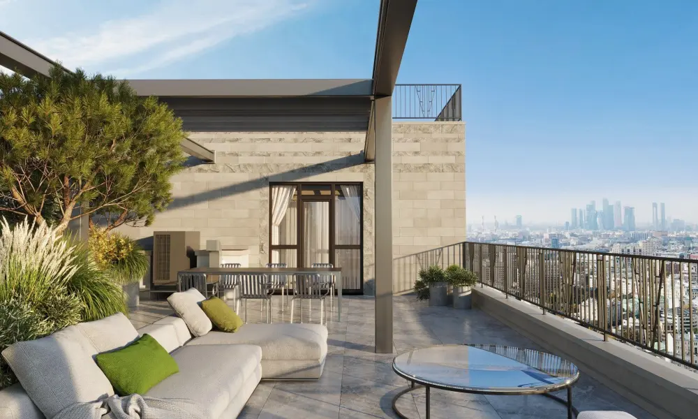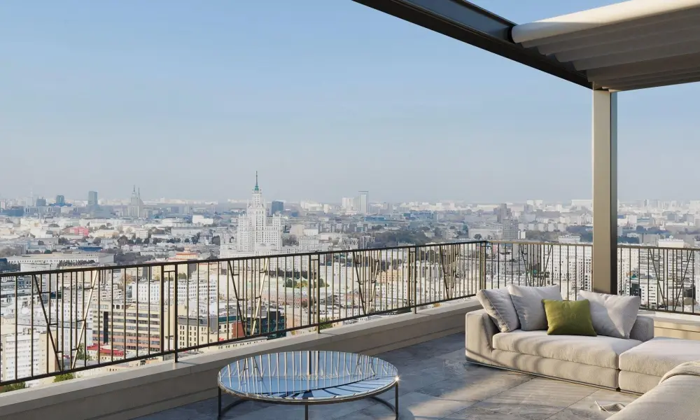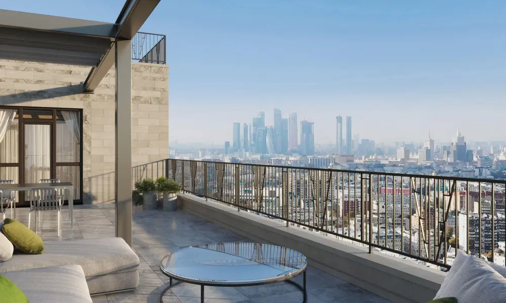 Апартаменты отличает правильная геометрия помещений и максимальное вовлечение естественного освещения. При высоте потолков от 3,3 до 4 метров размер окон составляет, в среднем, 2100х2100 мм. Стеклопакеты сделаны из натуральной сибирской лиственницы. Для обеспечения комфортного микроклимата резиденций комплекс оснащен системой центрального кондиционирования. этажи зонированы, на каждом из них расположено 4-6 апартаментов. В некоторых резиденциях есть собственные террасы, которые, благодаря своему расположению и строению ограждений, полностью скрыты от посторонних глаз.