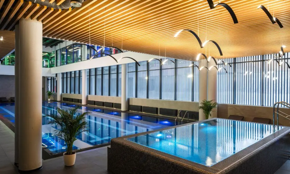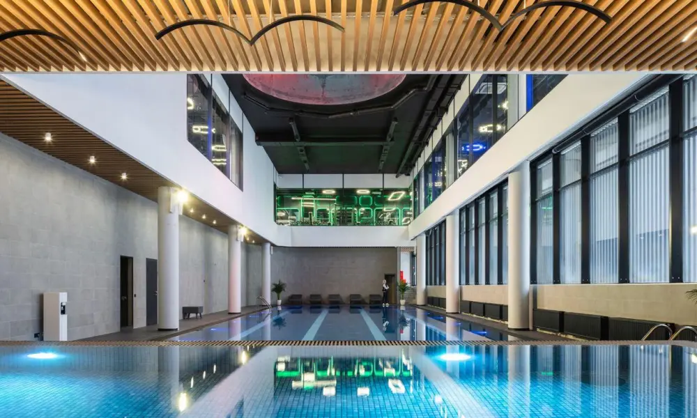 Внутренняя инфраструктура комплекса включает в себя размещающиеся в стилобатной части здания фудмаркет и ресторан «Амбар», детские комнаты и элитный фитнес-клуб с 25-метровым бассейном с четырьмя дорожками.