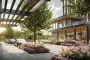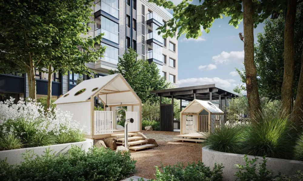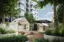 Симметричные секции Дома А формируют два закрытых двора-сада. Первый — патио — будет иметь гостевой характер с зонами для отдыха под открытым небом. Это тихая рекреация с мягкими диванами. Второй двор более традиционный с детскими площадками, с беседками и водопадом. Он реализует одну из ключевых ценностей проекта — возможность проводить время вместе с семьёй. Игровое оборудование и уличную мебель выполним в общей эстетике коллекции, в стиле и характере пространства, которое находится вокруг. Дизайнерские, спроектированные специально для Дома А, лаконичные, с привлекательным внешним видом.