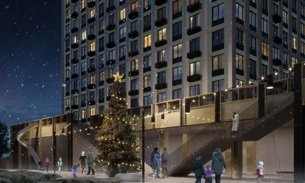 Уникальная инфраструктура района для людей, осознающих важность социального окружения. Умное пространство для работы, встреч и отдыха. На благоустроенной территории 5934 м² реализуется принцип: двор — вторая гостиная. Пространство двора предлагает большое разнообразие функций, которые заинтересуют пользователей с современным взглядом на комфорт — и рабочие зоны с зарядными станциями для техники, и лаунжзона с шезлонгами, и спортивная площадка, и мультимедийное пространство.
