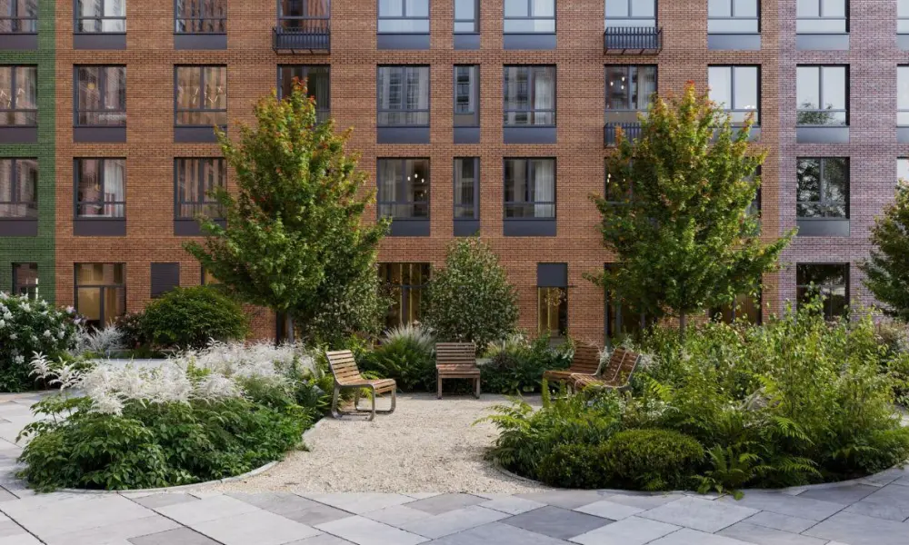 В отделке фасадов мы используем материалы природных оттенков: песочного, серого, зеленого, терракотового. Неоднородная текстура панелей выглядит естественно и благородно.Внутренний двор