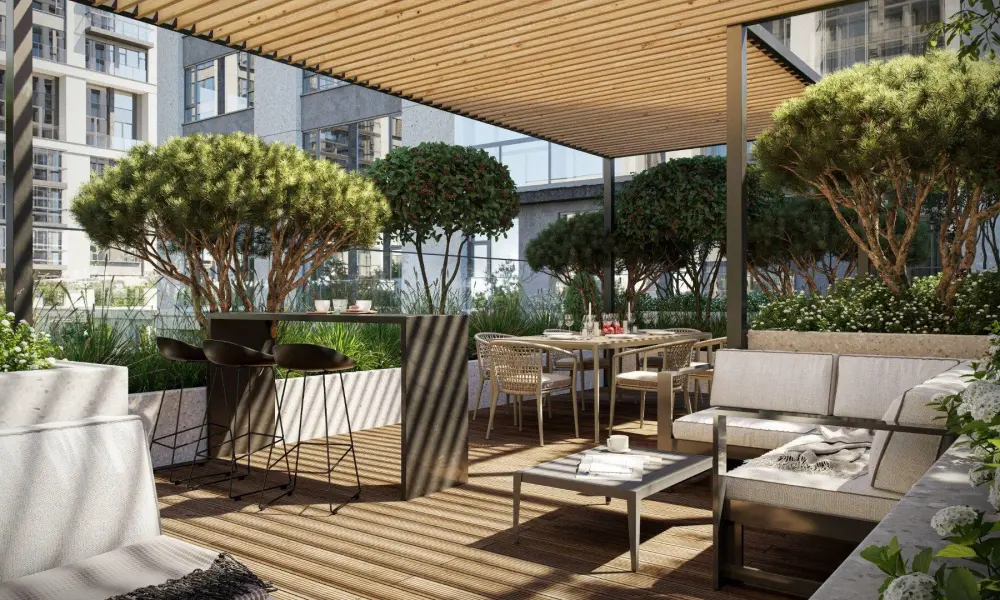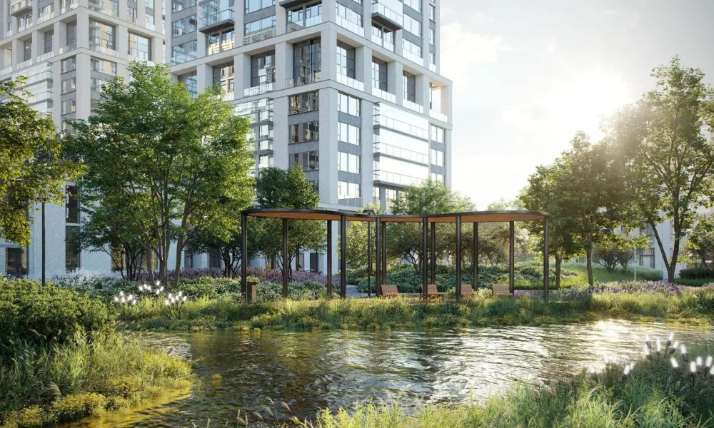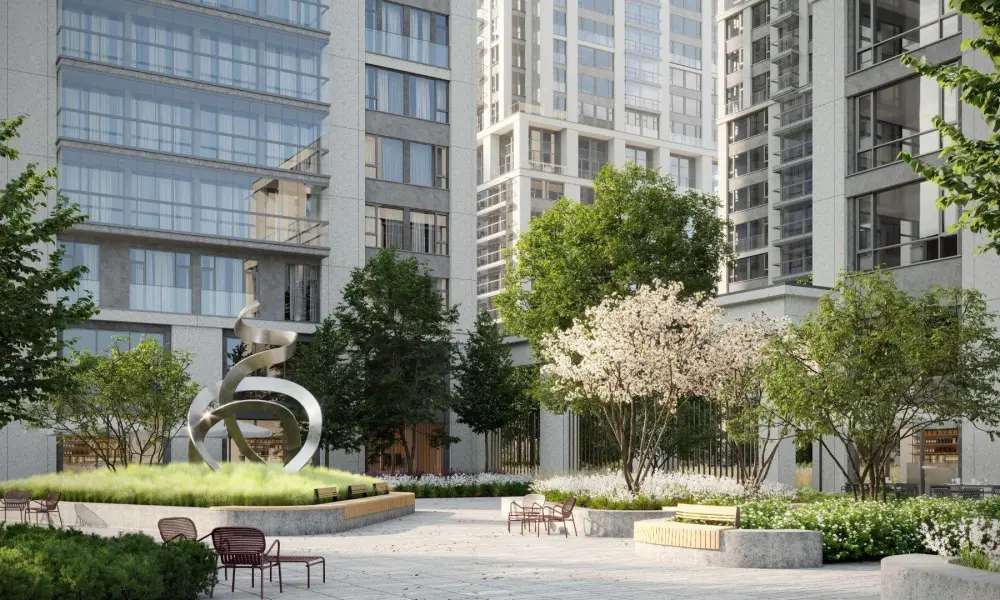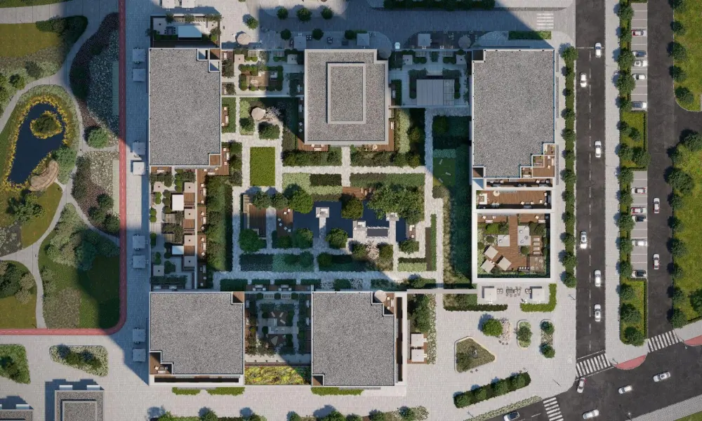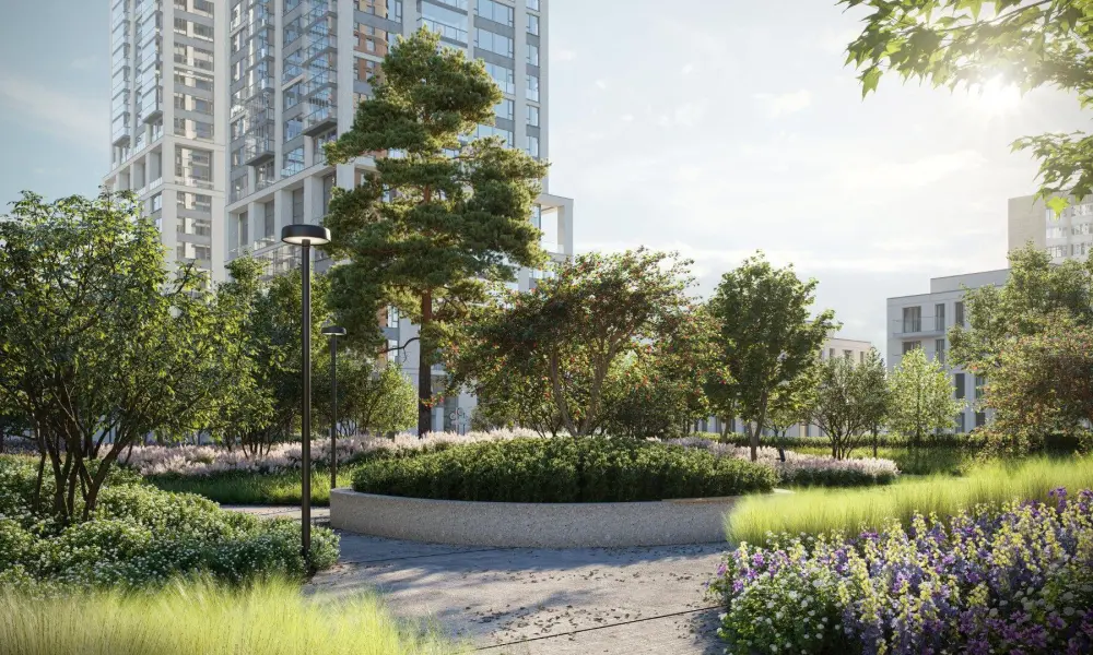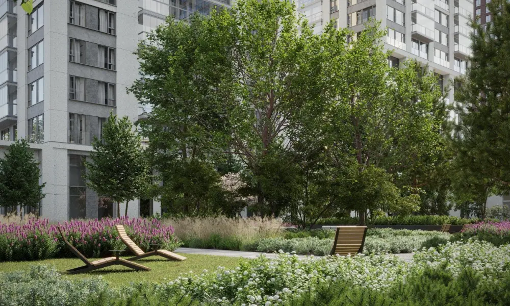 Приватный двор спроектирован в стиле лоскутного полотна и на 70% будет занят многоярусными растительными композициями. Функциональные зоны — для активностей и релакса — учитывают интересы жителей всех возрастов. Между корпусами располагаются зелёные террасы с частными патио, всесезонным садом, площадками для отдыха и детским уголком.