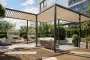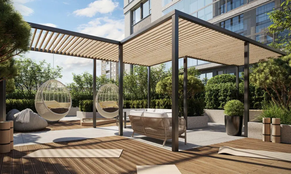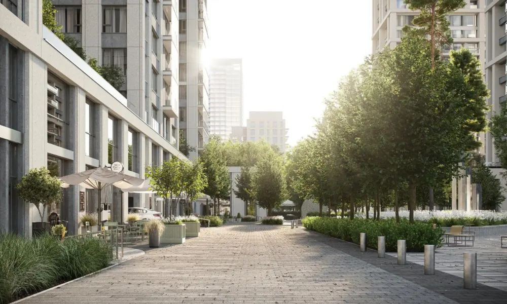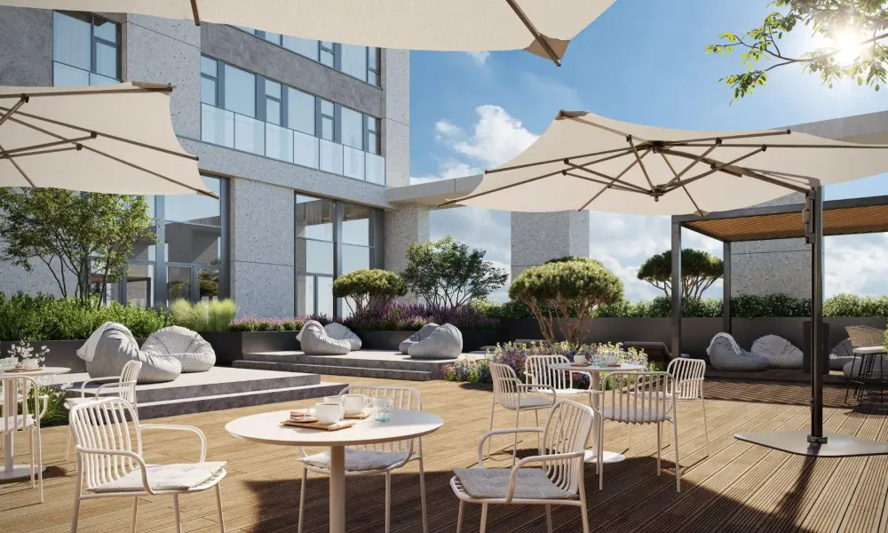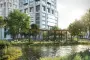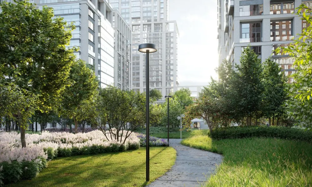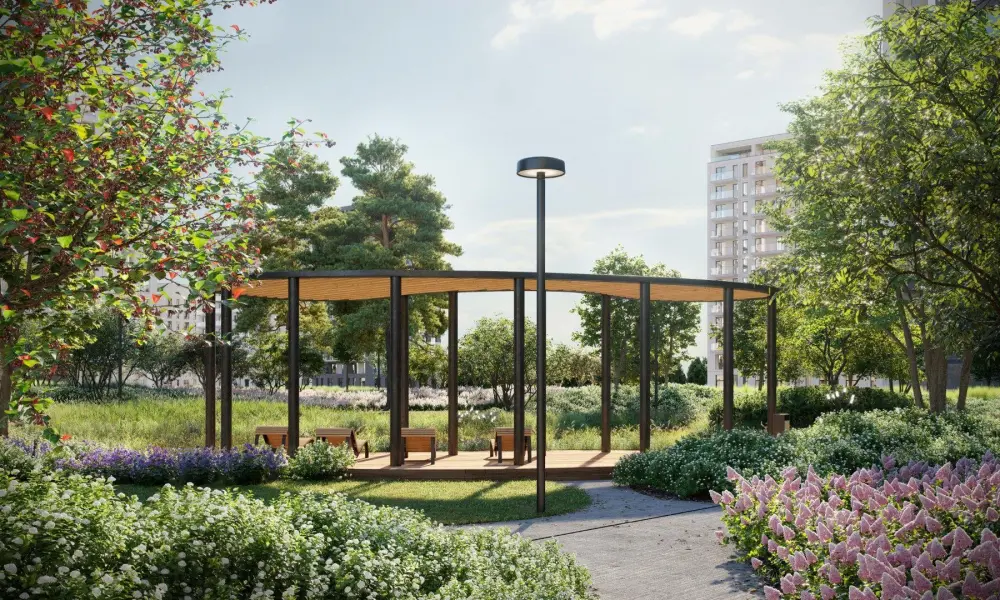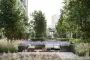 Приватный двор спроектирован в стиле лоскутного полотна и на 70% будет занят многоярусными растительными композициями. Функциональные зоны — для активностей и релакса — учитывают интересы жителей всех возрастов. Между корпусами располагаются зелёные террасы с частными патио, всесезонным садом, площадками для отдыха и детским уголком.