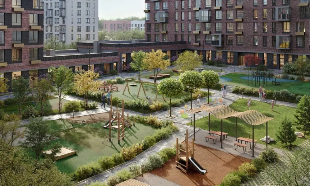 Зеленые дворы будут закрыты от машин. Они станут местом для отдыха на свежем воздухе, общения и детских игр. Жители смогут заниматься йогой на траве, играть в настольный теннис. Проект предполагает полностью безбарьерную среду: вход в подъезд расположен на уровне земли. Жителям не придется поднимать коляску или велосипед.