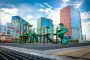 В каждом дворе обустроены современные детские игровые площадки с покрытием из мягкой резины. Для занятий спортом — спортивные площадки с разнообразным снаряжением и выделенные беговые и велодорожки. В едином гармоничном стиле выдержан весь ландшафтный дизайн микрорайона — зеленые газоны, туи, ели, цветочные клумбы в каждом дворе и удобные зоны отдыха с беседками.