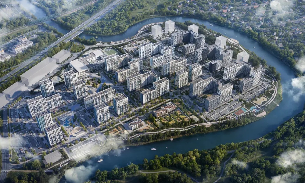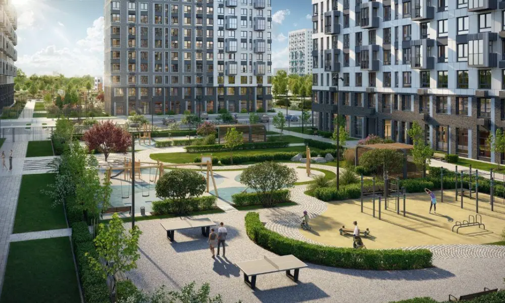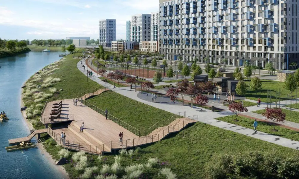 В самом центре жилого комплекса появится прогулочный бульвар «Речной берег» с магазинами и пешеходными дорожками, лужайками и воркаут-площадками, где можно заниматься спортом под открытым небом.