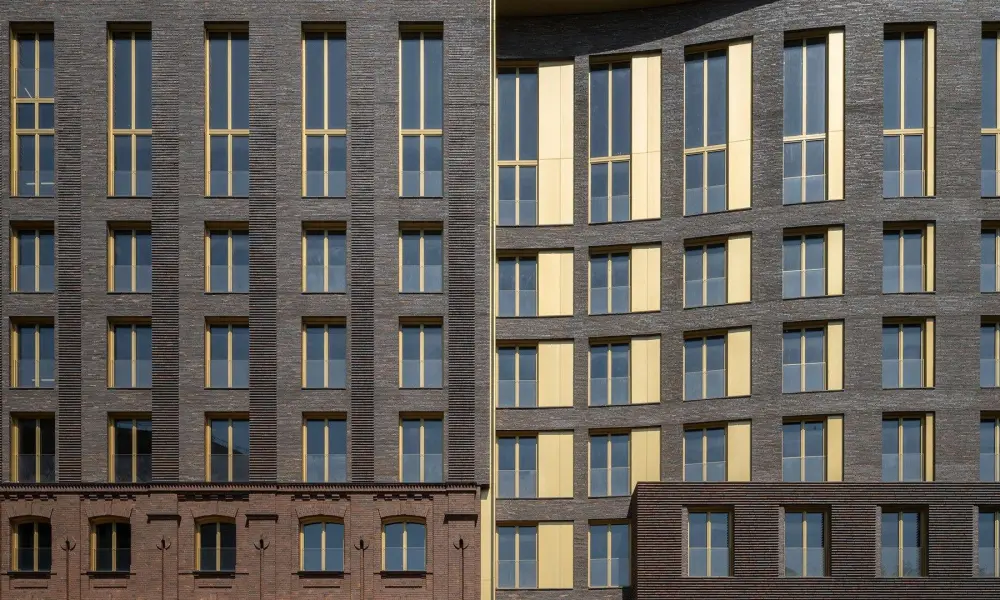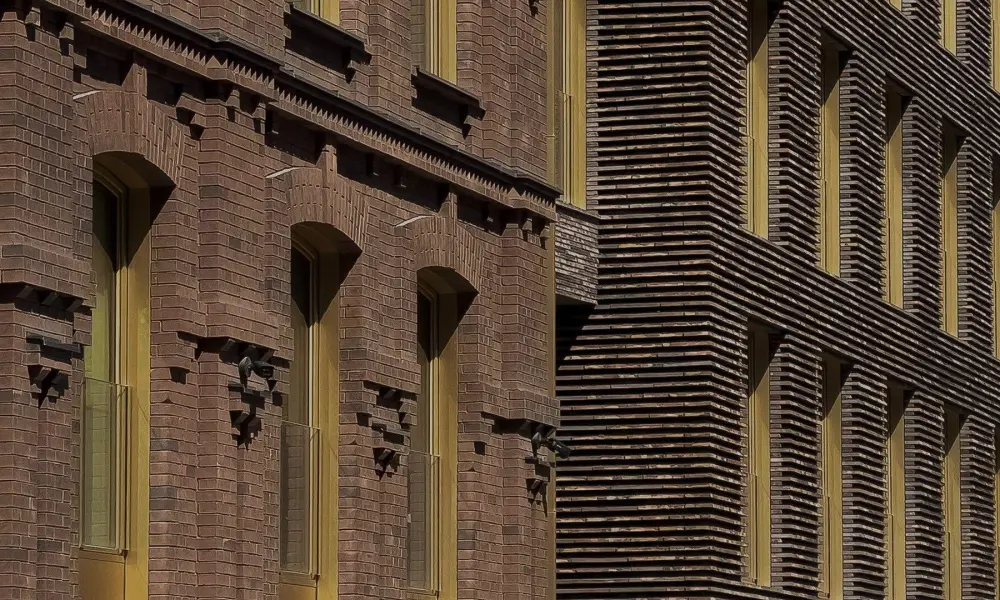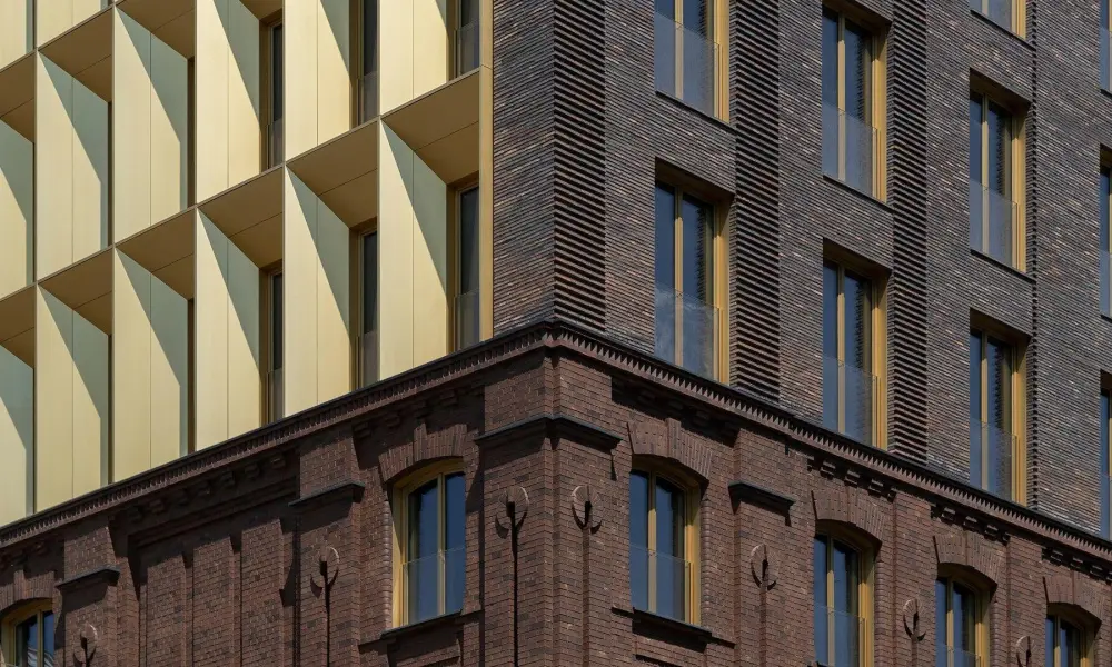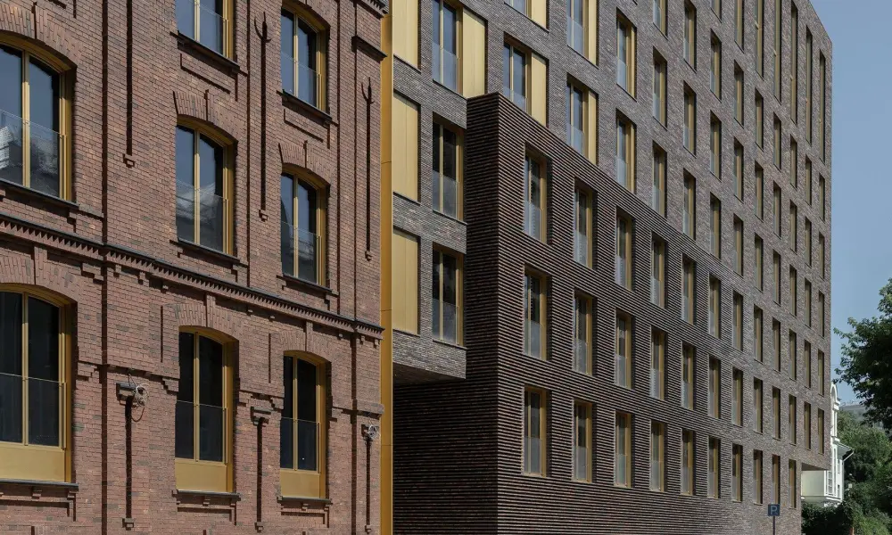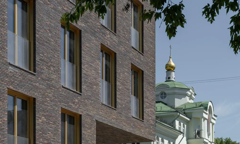 Дом гармонично вписан в исторический контекст района: две стены XIX века воссоздаются в соответствии с их первоначальным видом, а в качестве материалов для этих фасадов используется брусковый кирпич, максимально приближенный к оригинальному.