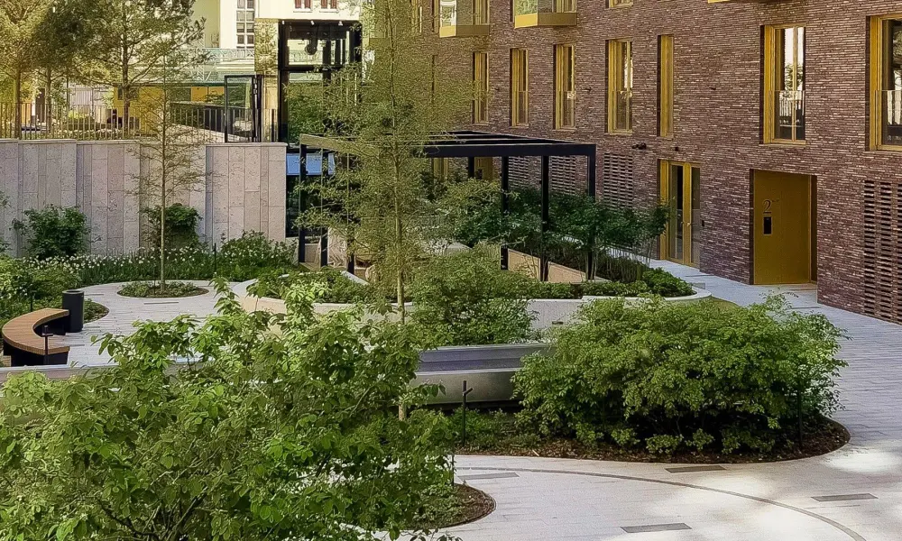 В современной части дома — датский кирпич Petersen Tegl, один из самых дорогих кирпичей в мире. Настоящая жемчужина проекта — благоустроенная внутренняя территория авторства британского эксперта по ландшафтной архитектуре Linda Bird Limited.