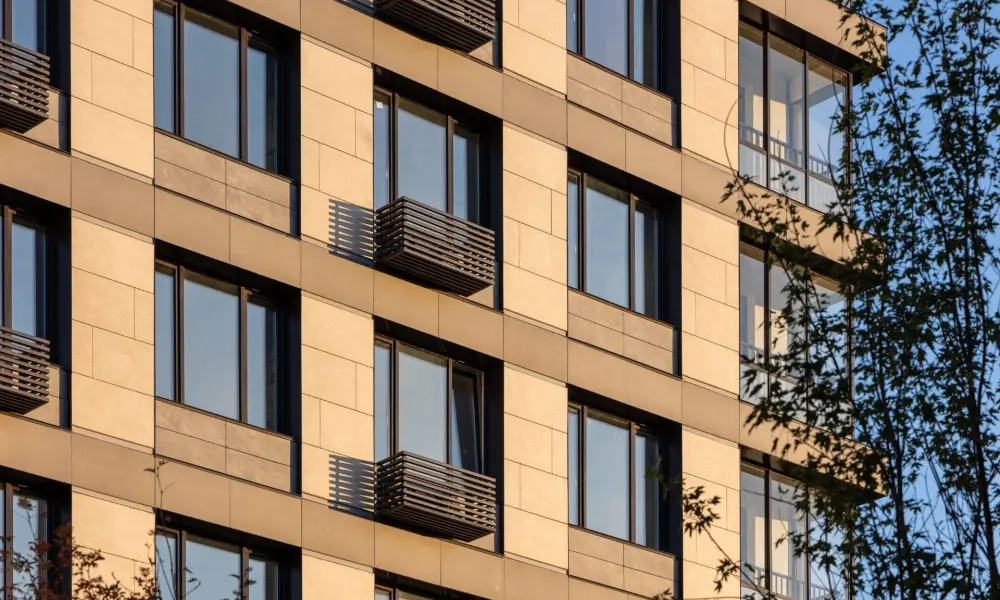 Фасады квартала – это игра вертикали с горизонталью. Трёхчастная структура башен проекта включает массив основания, облицованный керамогранитом тёплых тонов, уровень средних этажей с перемежающимися тёмными и светлыми элементами и зону верхних этажей с яркими вертикальными конструкциями.