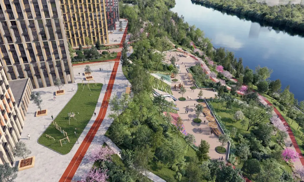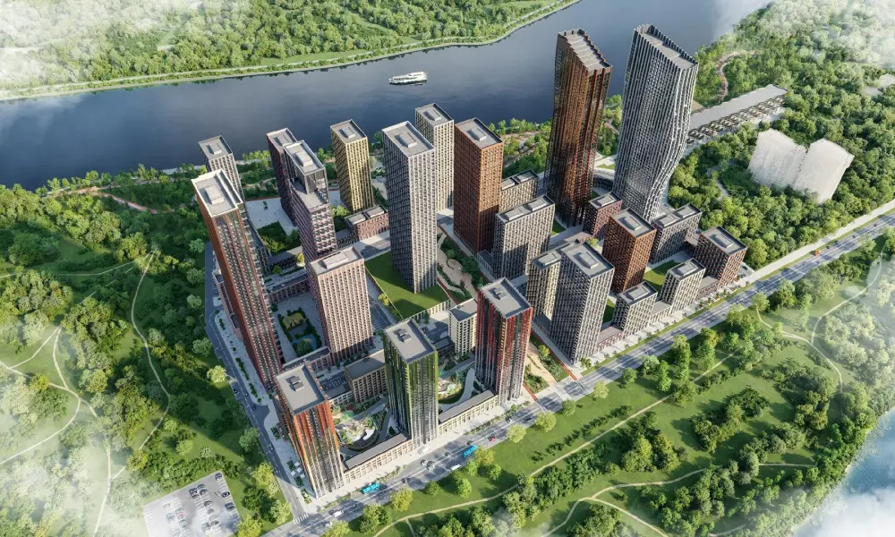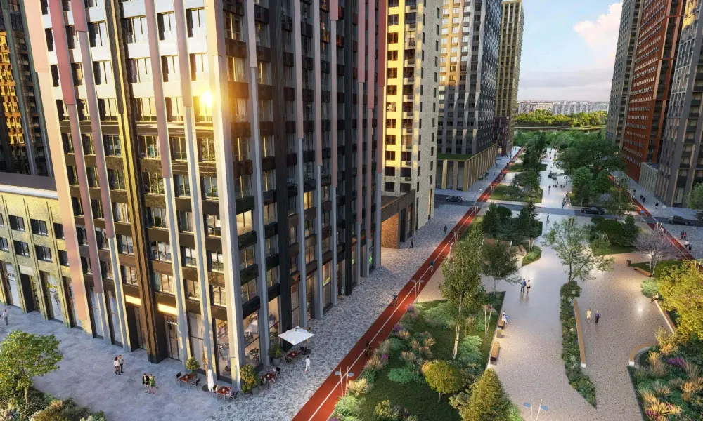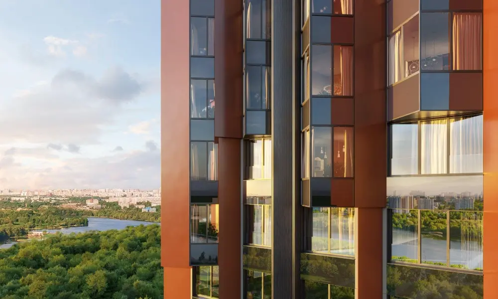 панорамные виды на воду и паркиблагоустроенная территория площадью 7,8 гаавторская архитектуравысококачественная отделка MR Baseнасыщенная собственная инфраструктурадетские и спортивные площадкизакрытый дворподземный паркинг