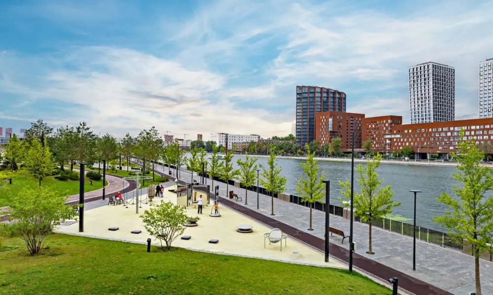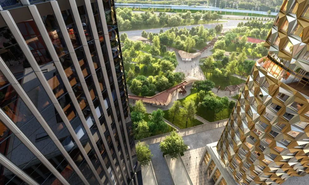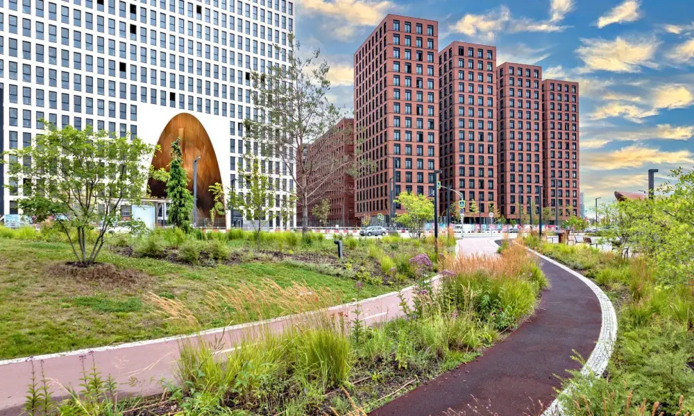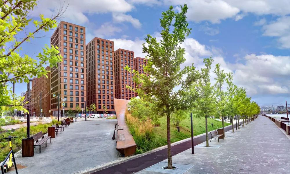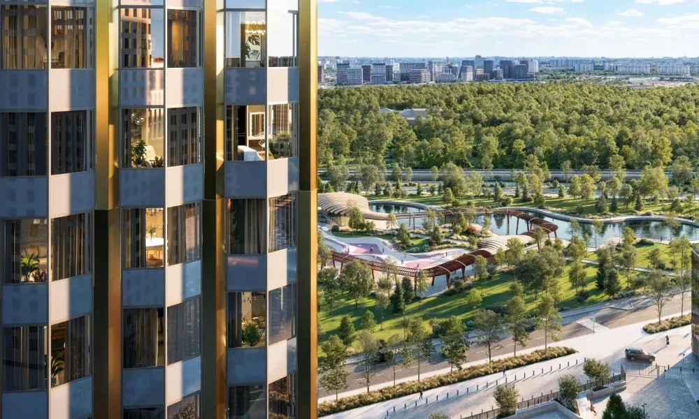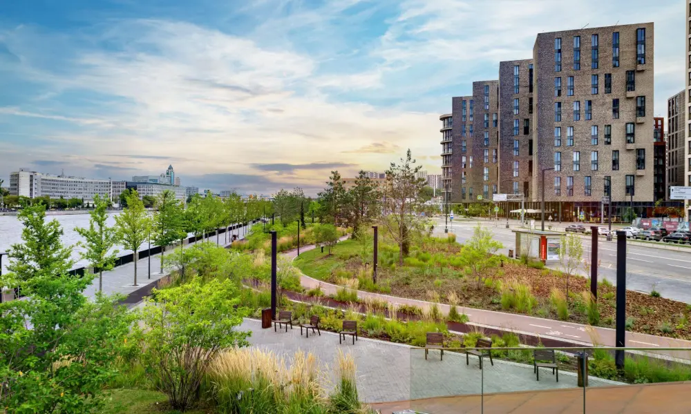Половина территории жилого комплекса отдана под зеленые насаждения. Здесь даже есть два собственных парка: «Тюфелева роща» и парк на набережной Марка Шагала. Первый, созданный по проекту ландшафтного дизайнера Джерри Ван Эйка, имеет в своем составе искусственный пруд и раскинулся на площади 10 Га. Второй, с местами отдыха и торговыми павильонами, тянется вдоль новой набережной столицы на протяжении одного километра.